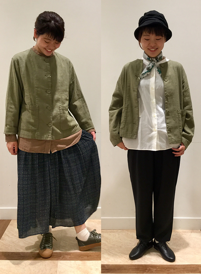 ★リファルコノーカラージャケット ¥5,489/ リファルコシャンブレーシャツ ¥4,389/ ガラプリーツイージースカート ¥5,489/ カラーソールスニーカー ¥3,850/ バックギャザーブラウス ¥5,489/ マルチキレイメイージーテーパードパンツ ¥4,389/ 大槻優美さんコラボマルチスカーフ ¥2,189/ アサコンヘンケイキャスケット ¥2,750/ ソフトレースアップシューズ ¥4,950