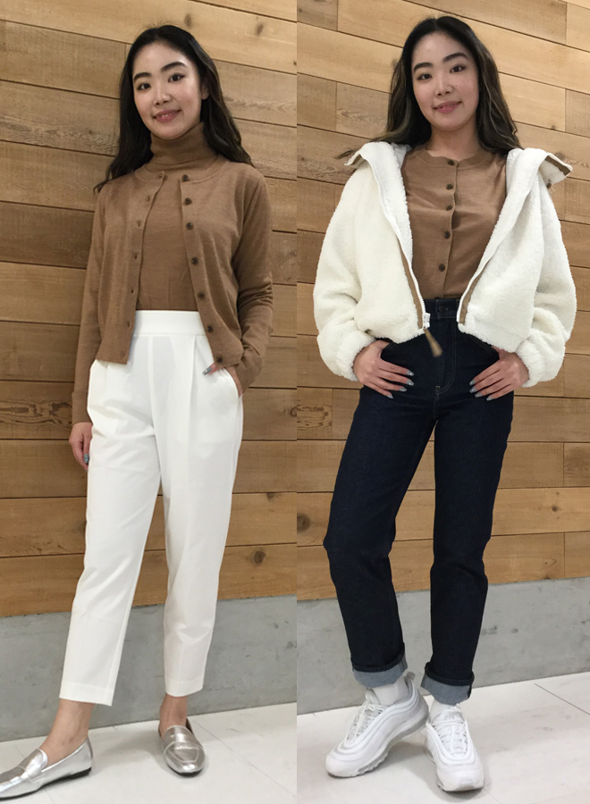 ★メリノカーディガン ¥3,990/メリノタートルセーター ¥3,990/スリムウェストゴムパンツ¥2,990/シェルパジャケット ¥8,990/スカハハイストレートデニム ¥5,990