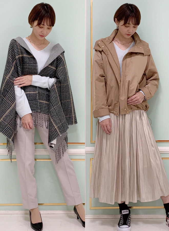 ★カシミアタッチVネックプルオーバー ¥2,739/EASY CARE ウォッシャブルフラノツータックテーパードパンツ ¥3,938/リバーシブル2wayストール ¥2,838/ふんわりパンプス ¥4,378/ライナー付き撥水マウンテンパーカー ¥9,878/フェードアウトシャイニースカート ¥5,038/CONVERSEスニーカー ¥6,600