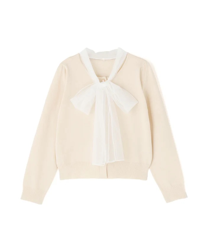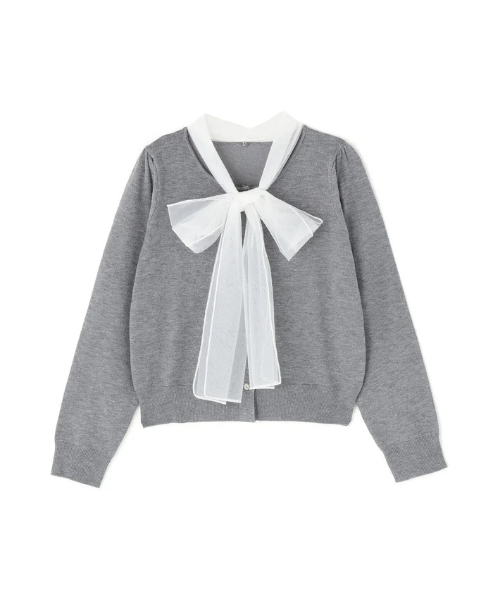 チュールのビッグリボンタイが愛らしいニット。チュールリボンタイは取り外しても着用いただけます。羽織りとしても使えますが、前ボタンを留めてプルオーバー風に着こなすのがおすすめ♡♡
