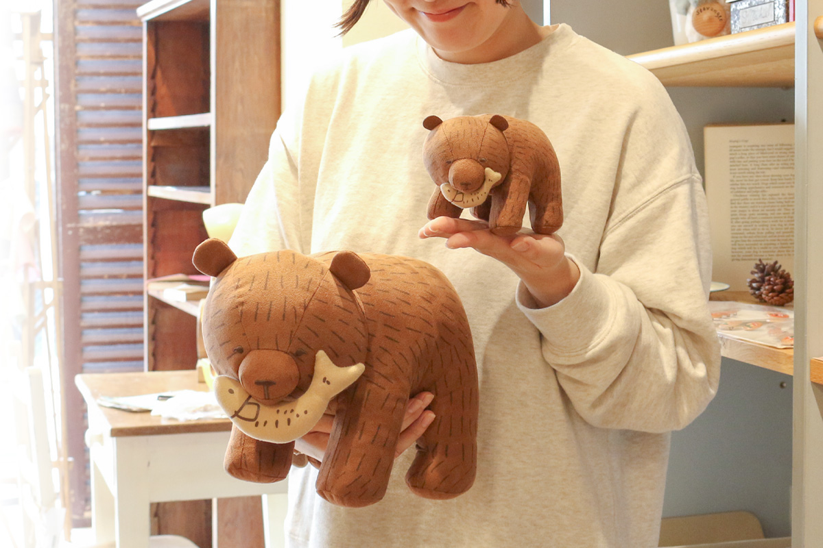 そんな木彫りクマをころんと丸みのある、かわいらしいぬいぐるみにしました。