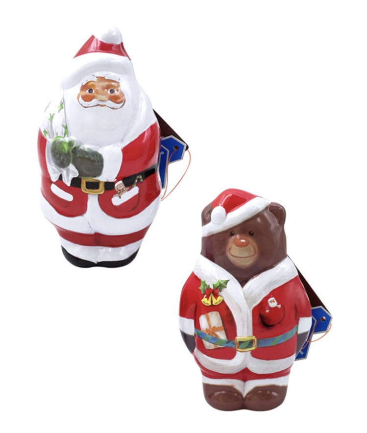 コロンと丸みのあるフォルムが可愛らしいサンタさんとクマさんの缶に、ビスケット・キャンディ・チョコレートのお菓子が入ったアイテムです。