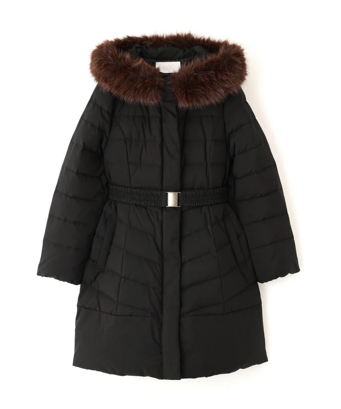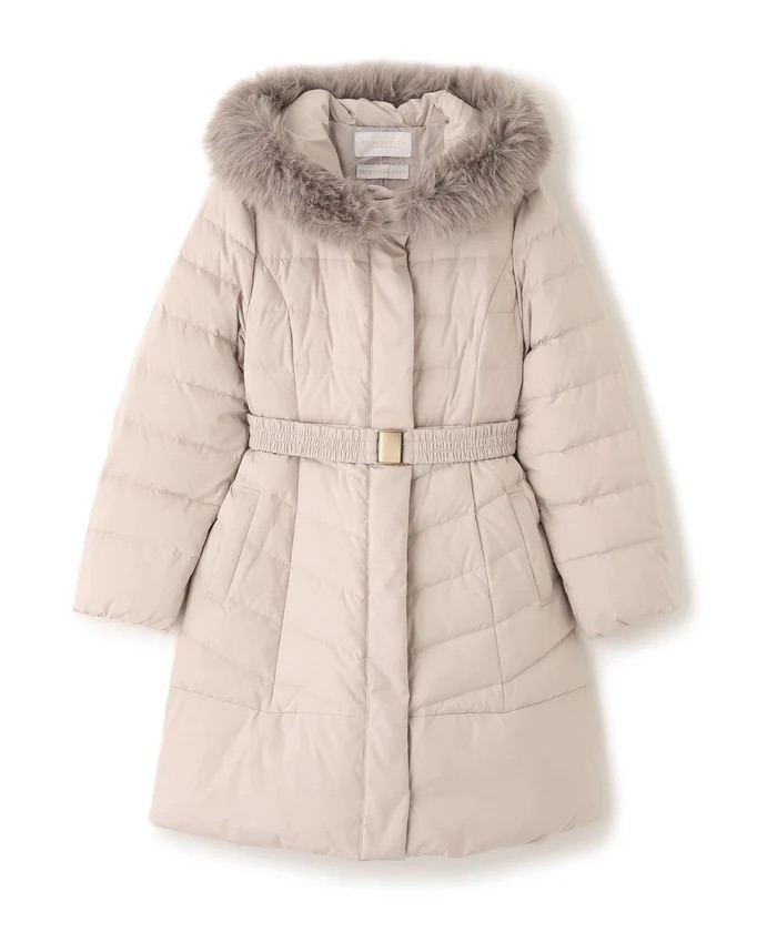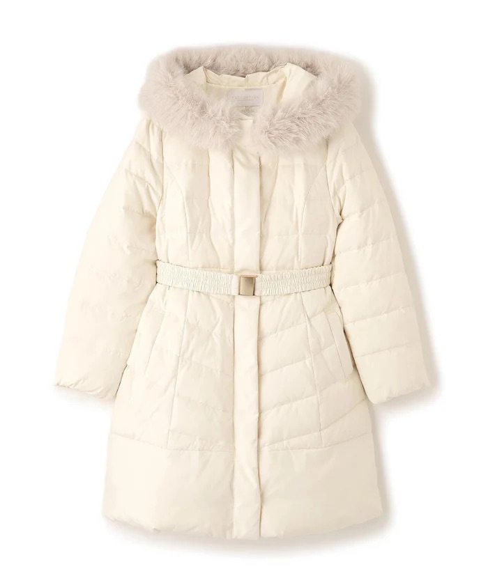 スタイルアップが叶うベルト付きダウンコート。付属のベルトでウエストマークすると、女性らしいシルエットを演出します。フードまわりのフェイクファーは取り外し出来ます◎。