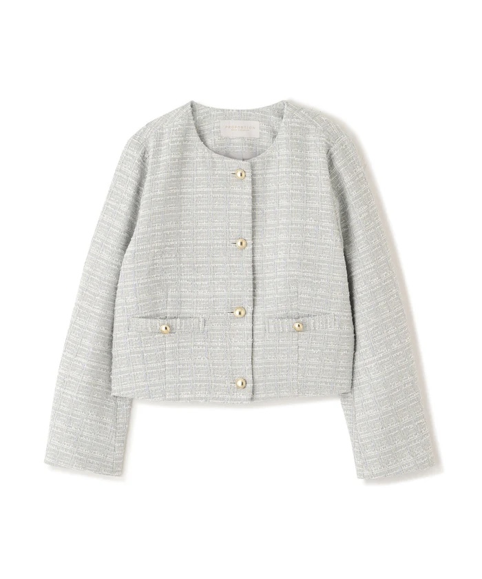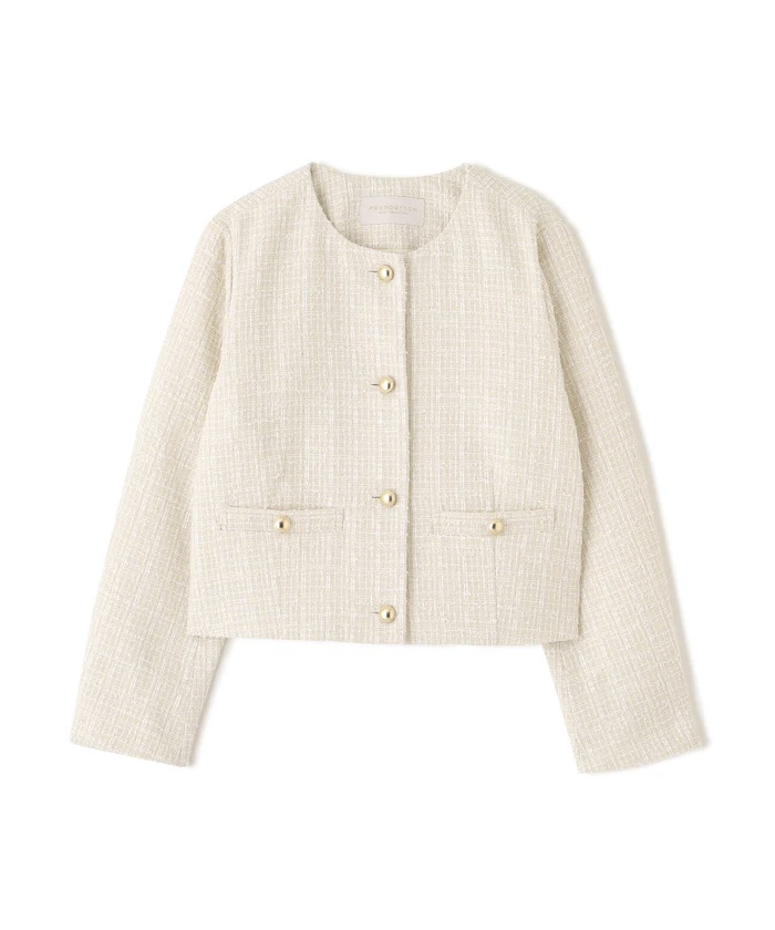 ラメ糸入りツイード生地が大人かわいいノーカラージャケット。春らしく華やかなライトブルーと上品なエクリュカラーの2色展開です。フェミニンにもカジュアルにも着回せ、オンオフ問わず活躍してくれます♪