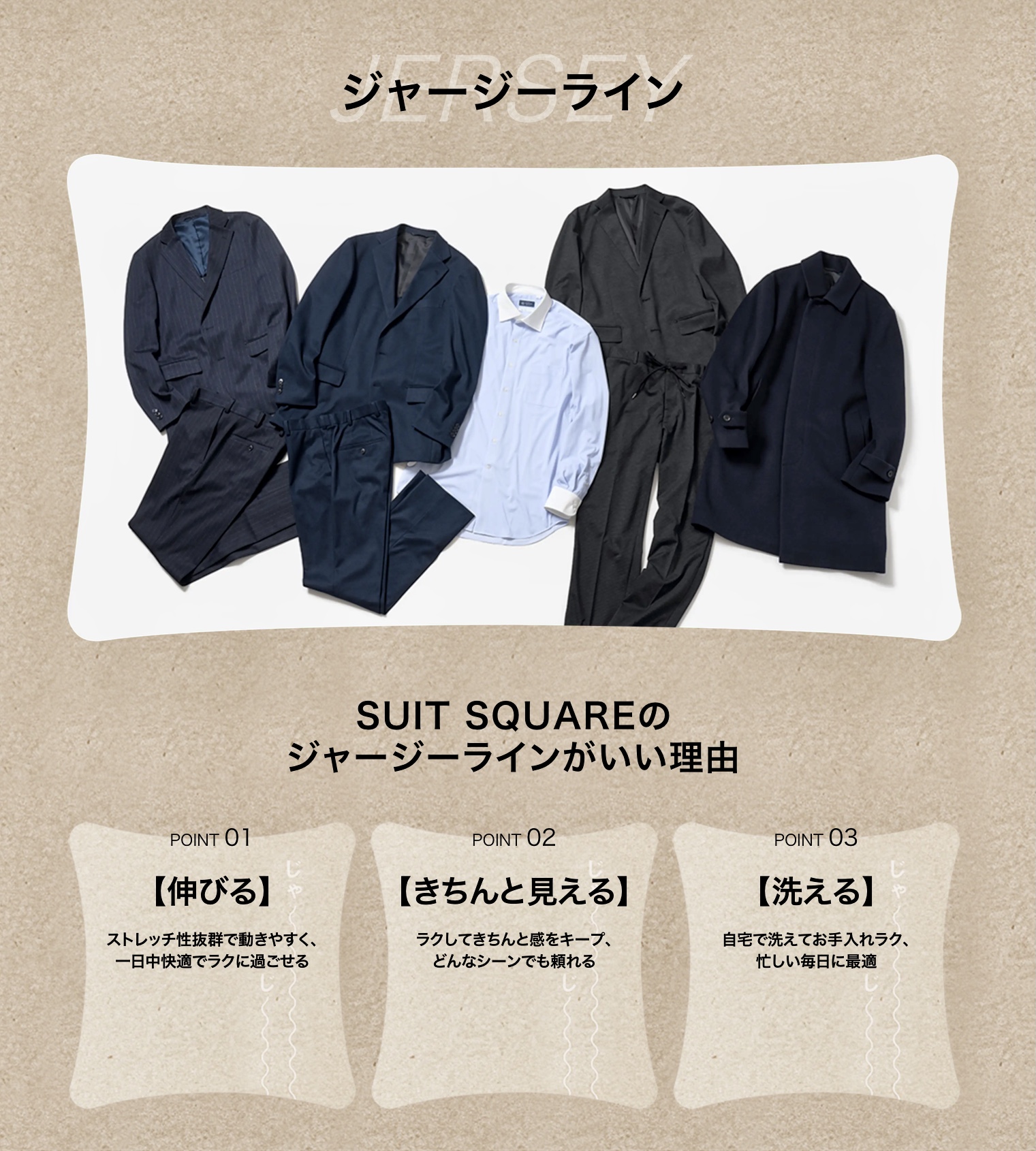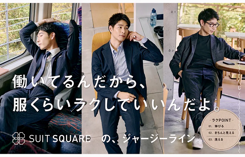 今までにジャージースーツでは出せないキッチリ感とラクさを両立したスーツスクエアのジャージースーツを是非一度お試しください。