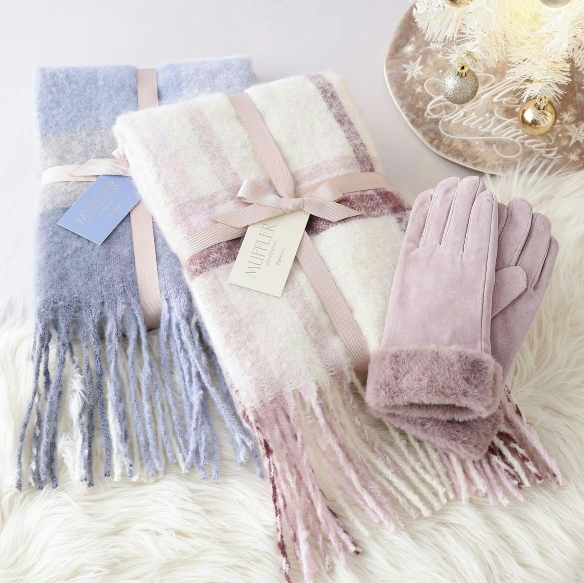 マフラーはファッションに合わせやすいワンカラーと、コーディネートのワンポイントになるチェック柄の2種類♥