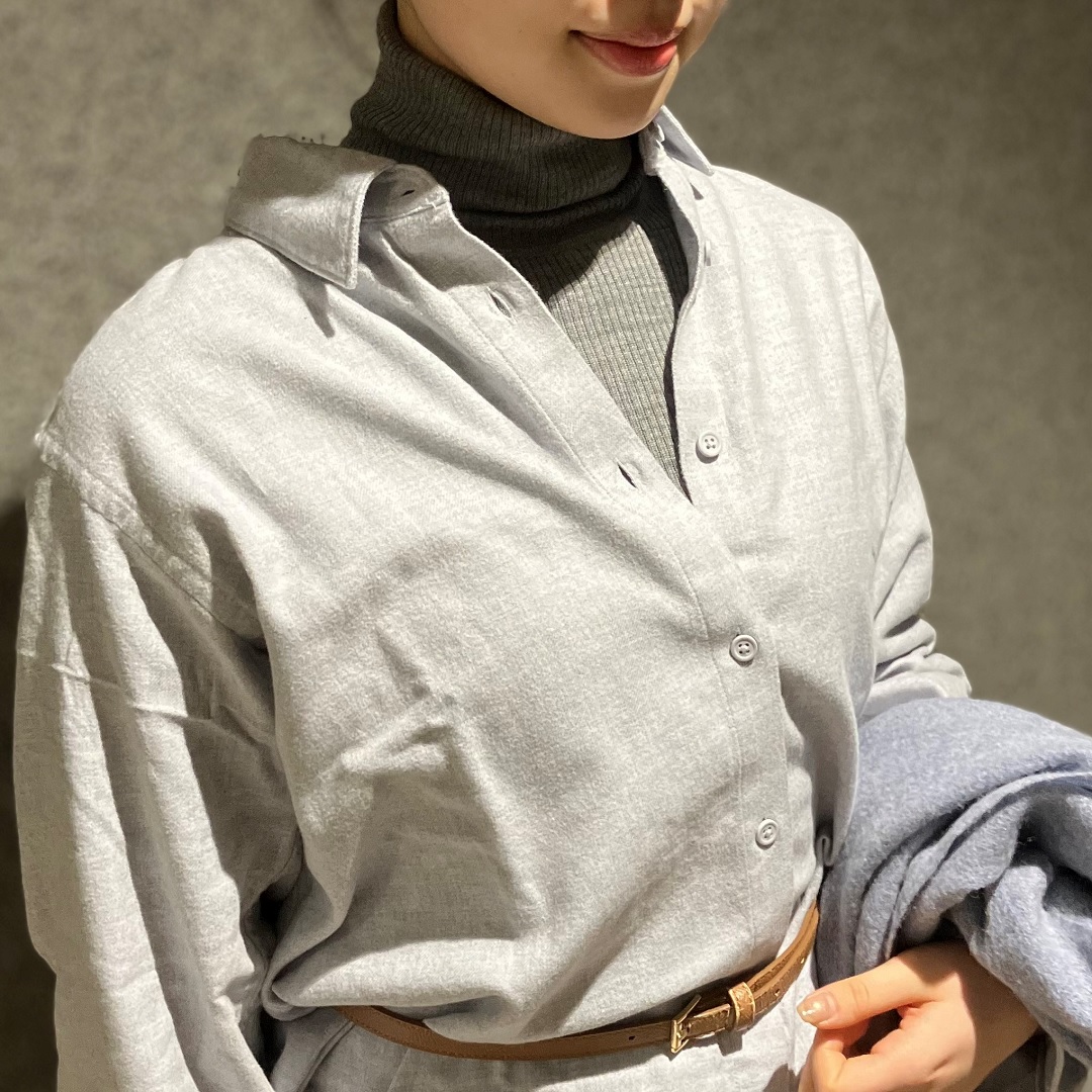 フランネルのシャツにタートルネックのセーターを重ね着し、ブルーのデニムを合わせました。ブルーとグレーの2色でまとめて大人っぽく仕上げました。