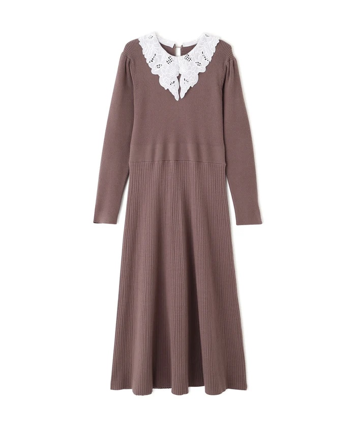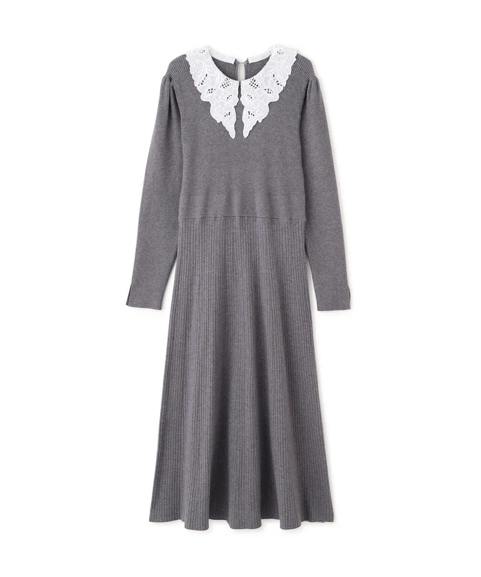 オリジナルのレース襟がポイントのニットワンピース。トレンドのレース襟は存在感があり、一枚で様になるデザインです。リブ編みなので程よく体のラインにフィットしながら、ウエストから広がるフレアラインをキレイに演出してくれます♡