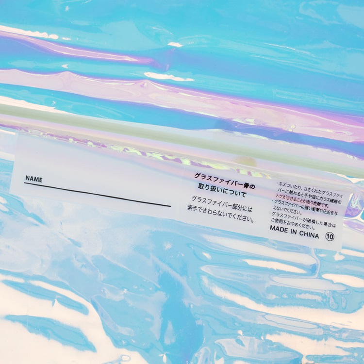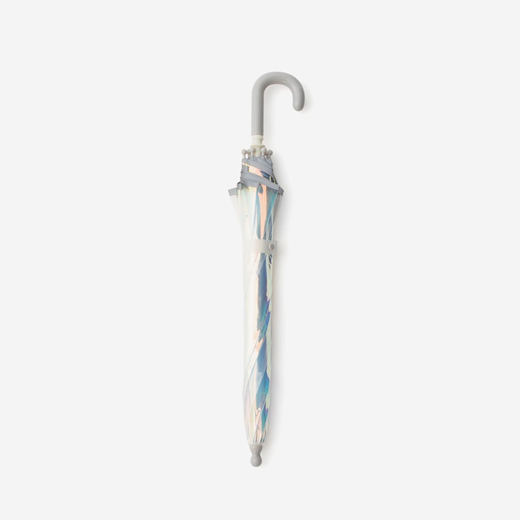キラキラと虹色に輝く、ビニールタイプのキッズ長傘です。見る角度によって色の変化が楽しめます。