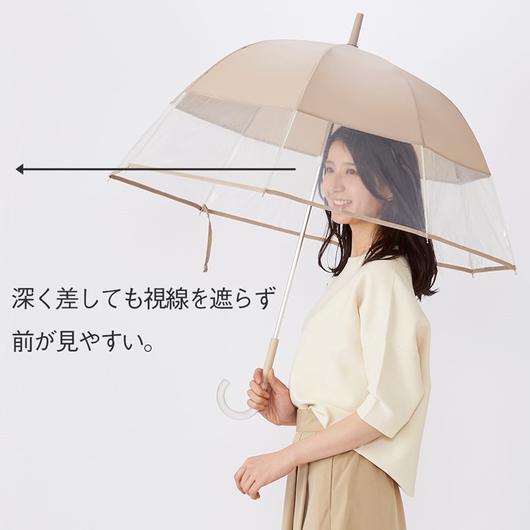 親骨の長さは65cmの大き目サイズ、ドーム型になる深張りタイプで肩まですっぽりと覆ってくれます。