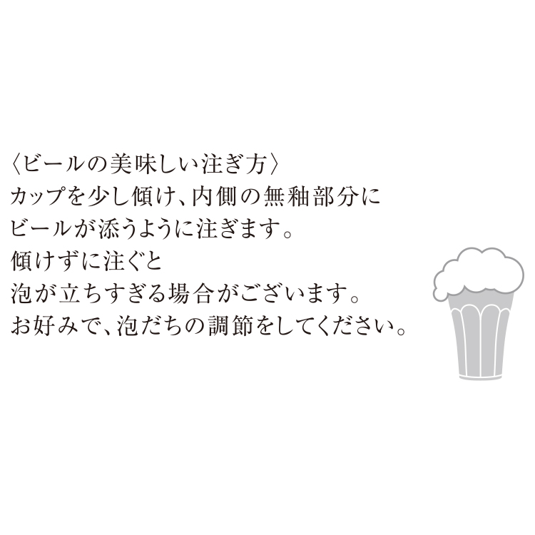 内側は無釉で仕上げることで、ビールのきめ細かい泡立ちが楽しめる陶器製のビアタンブラーです。