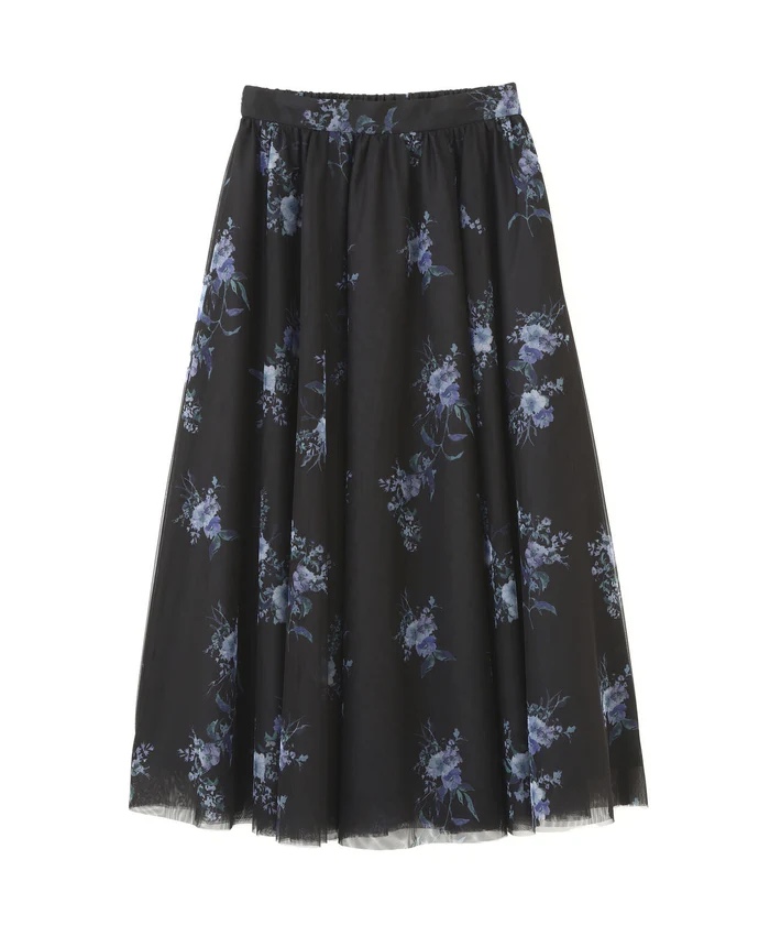 オリジナルの花柄をあしらったチュールスカート。ボリュームのあるチュールを二枚重ねたドラマチックなデザインで、短めトップスとも相性バツグンです。華やかな配色が目を引き、コーディネートに取り入れると主役になれるアイテムです♡