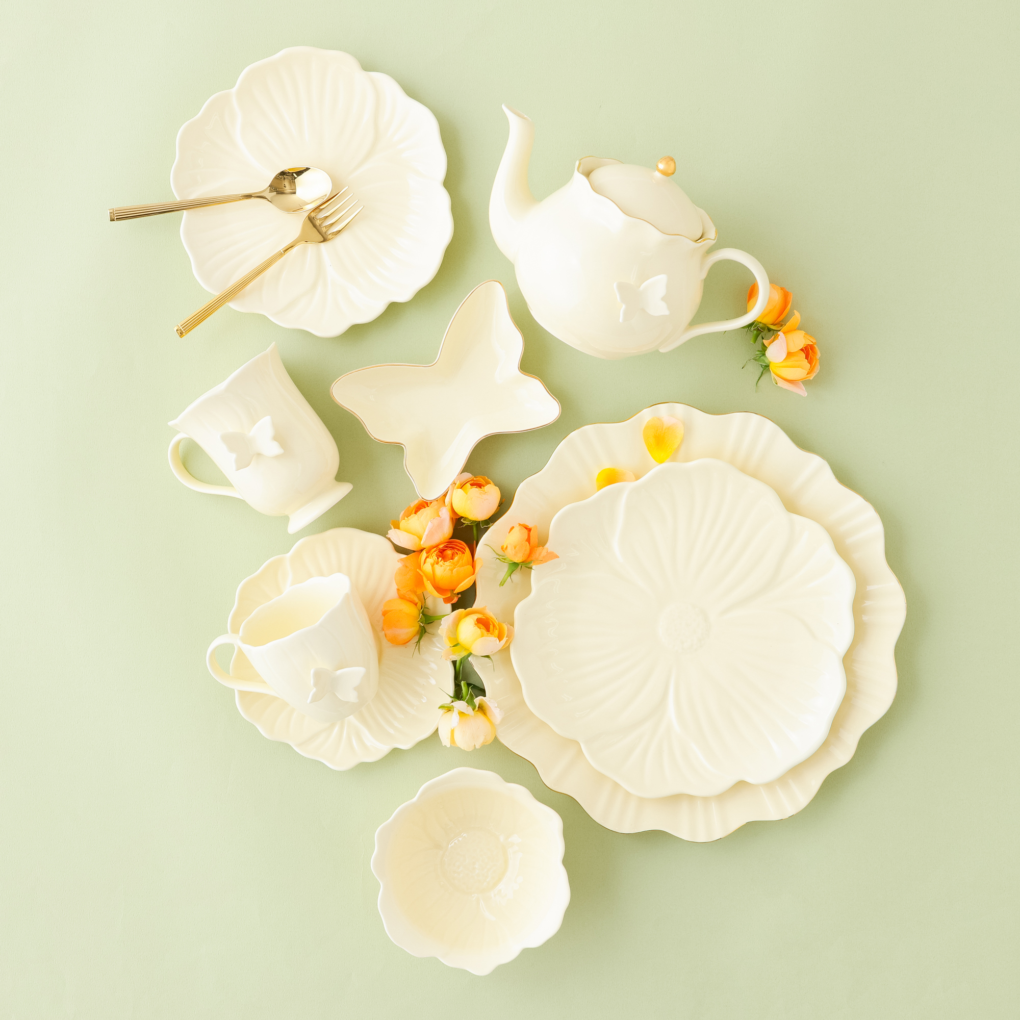 花をモチーフにしたプレートやカップ&ソーサー、ティーポット、マグ、ケーキスタンドまで揃う、可憐なテーブルウェアコレクションです