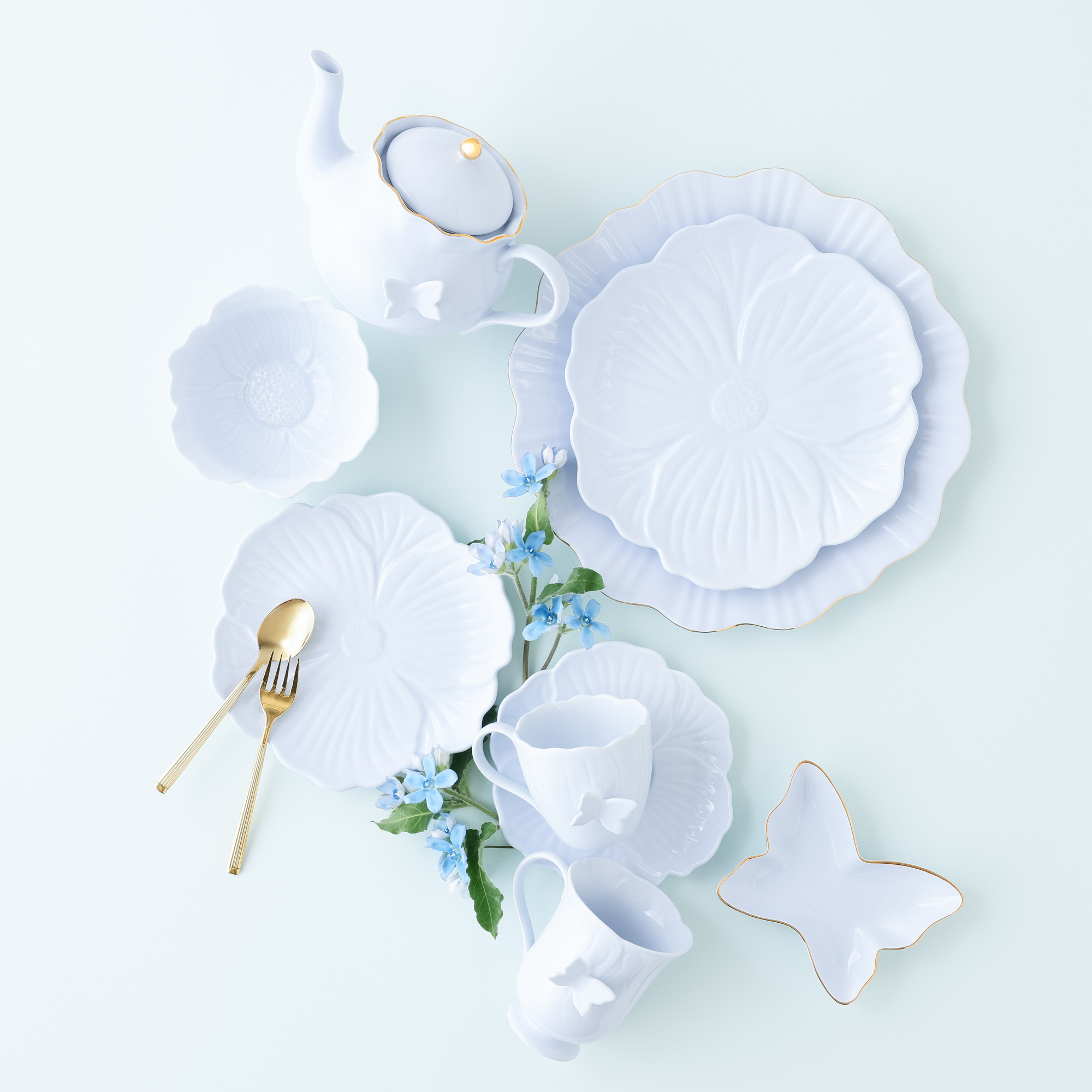 お花や蝶モチーフをふんだんに取り入れたテーブルコーディネートで、花咲く春のティータイムを楽しめるカフェアイテムを展開中✿