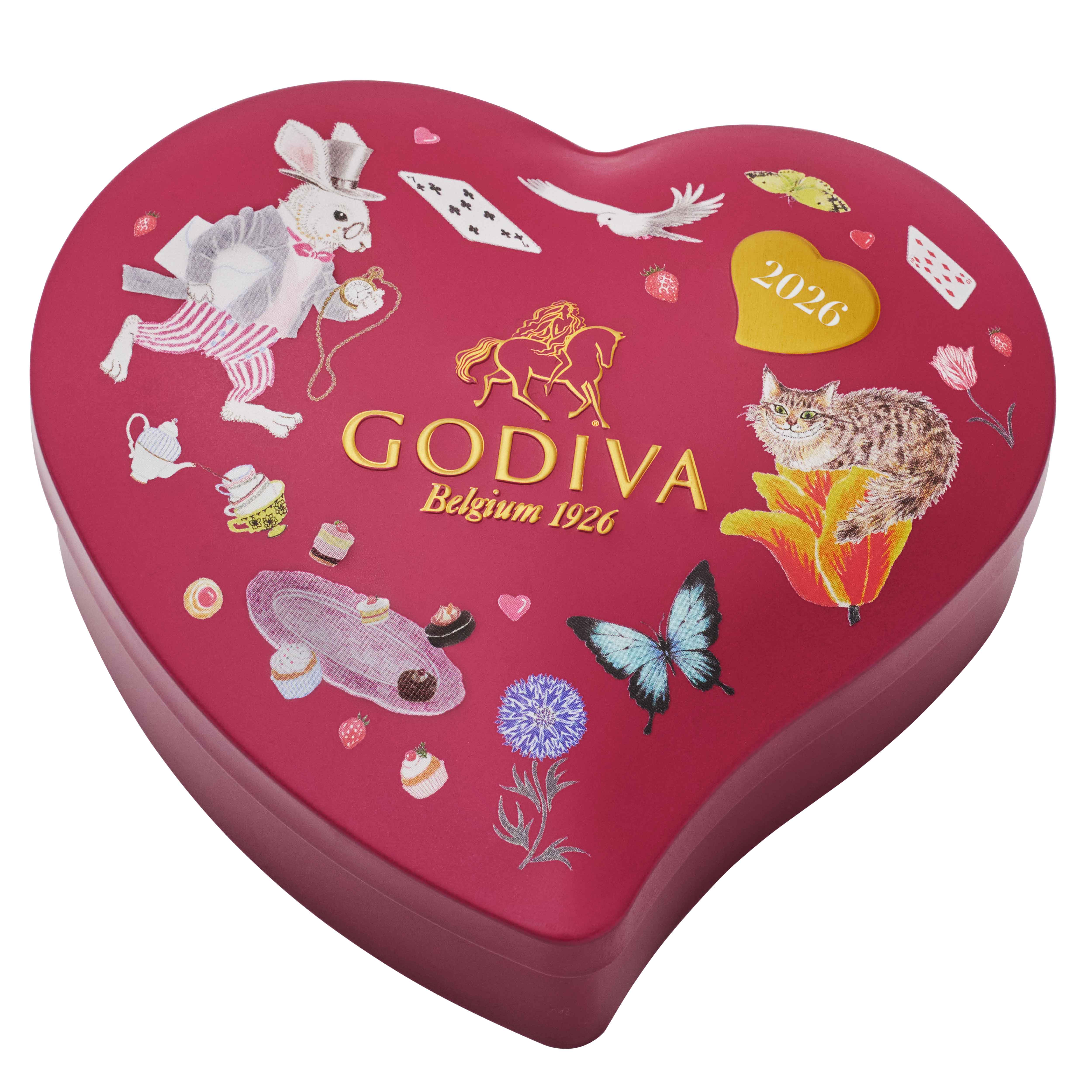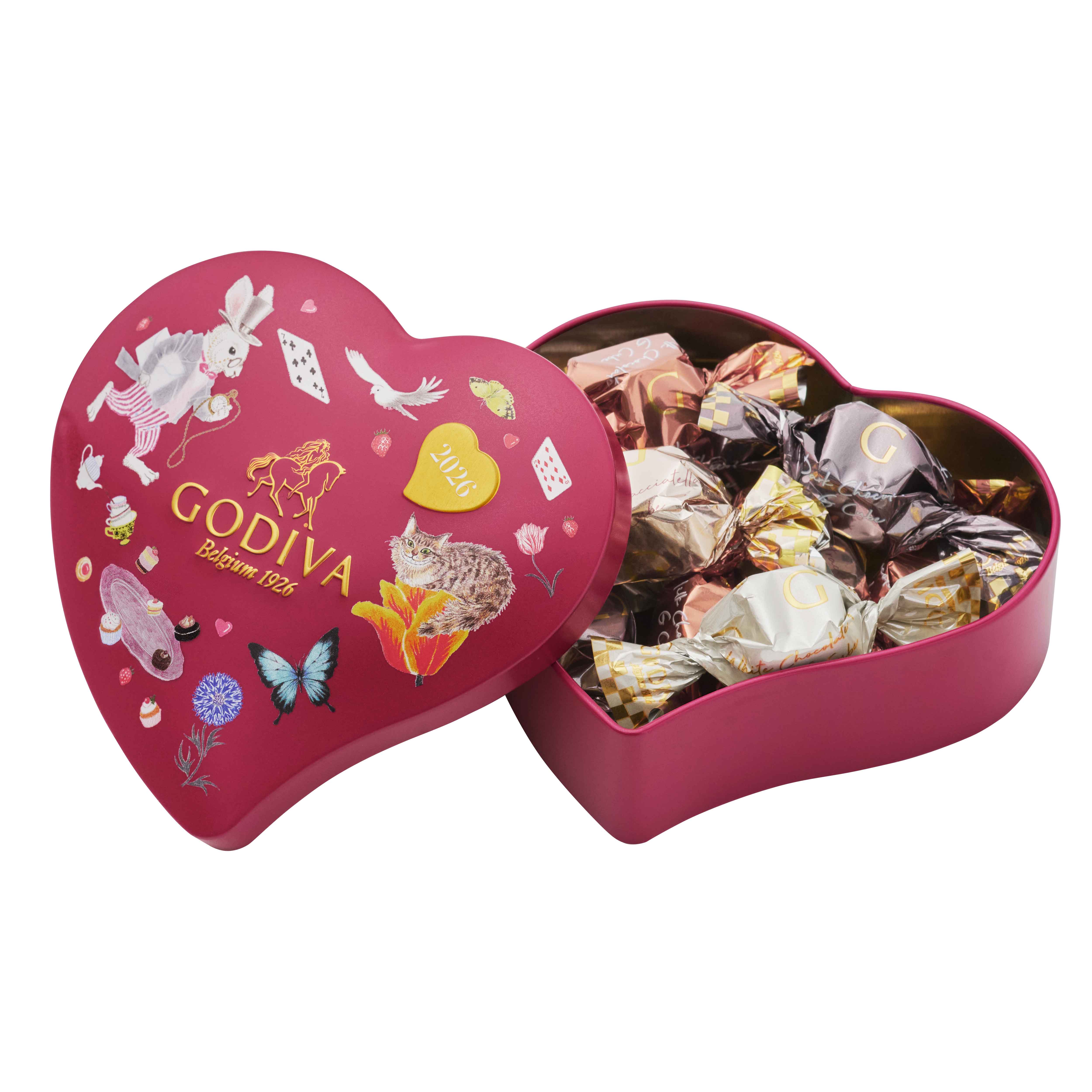 大人かわいいタッチで描かれたチェシャ猫や白うさぎをデザインしたハート形の缶に、ホワイトチョコレートプラリネ、ミルク、ダーク、2026年バレンタインより新登場のダーク ストラッチャテッラのG キューブ チョコレートを詰め合わせました。