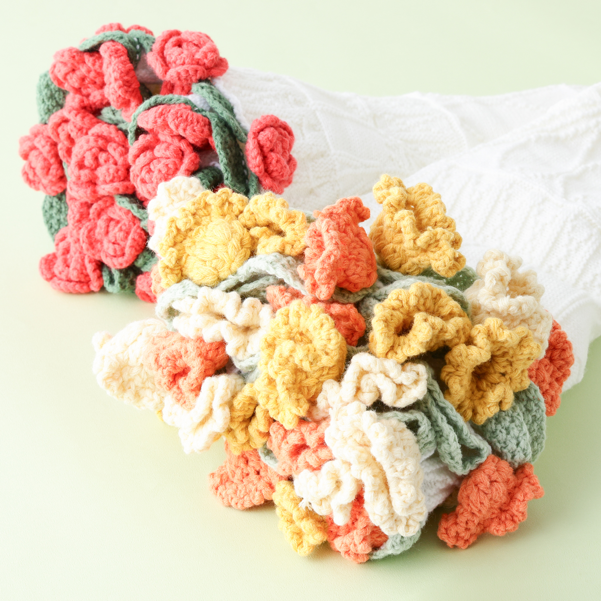 花びらの形状にこだわったお花の部分は、ひとつひとつ手編みで編まれており、バラのようなレッドと、カラフルで明るい印象のオレンジ2種類をラインアップ!