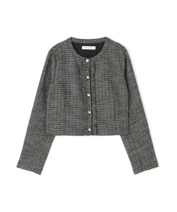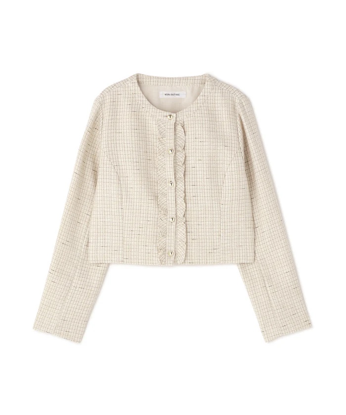 フロントの控えめなフリルが上品なアクセントのツイードジャケット。コンパクトな丈感なのでスタイルアップして見えます。同素材のスカートとのセットアップもおすすめです。さりげないラメ糸が織り込まれた品のある春ツイードを使用しています。華やかなオケージョンシーンにぴったりなアイテムです♪
