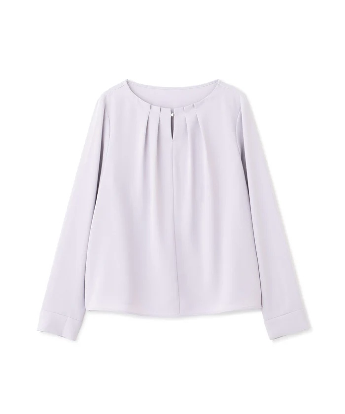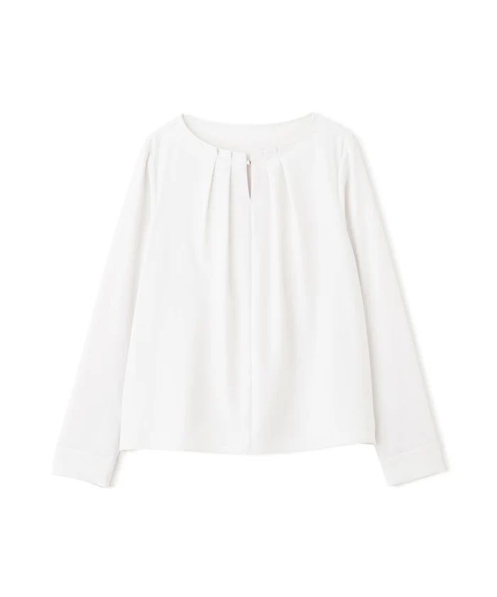 襟元のタックデザインが上品な印象のブラウス。さり気ないスリットとライトゴールドカラーのホックがアクセントになっています。スカートもパンツも合わせやすく、ジャケットインも決まるのでオフィスシーンにおすすめです♪