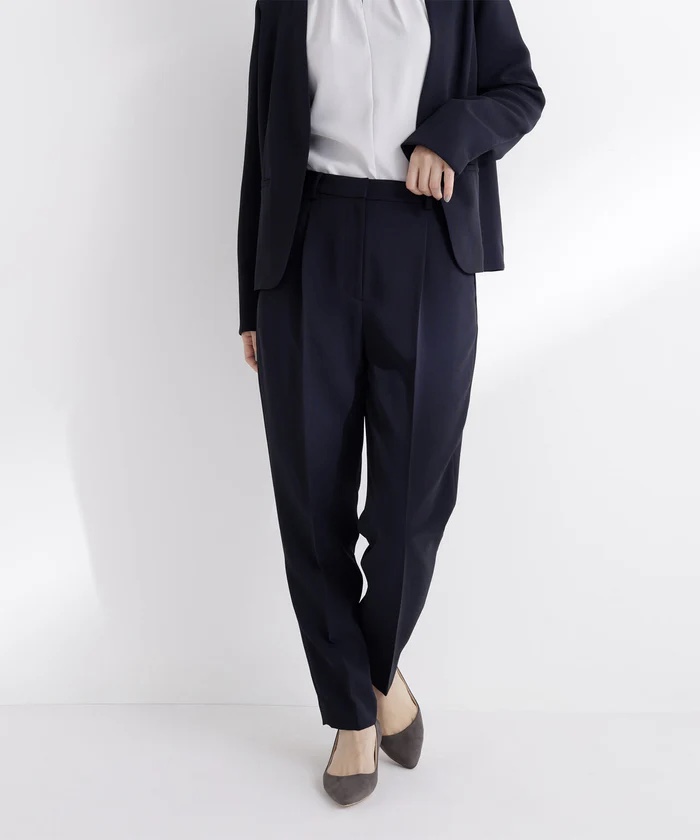 ストレッチ性のある素材で動きやすく、長時間の着用も快適なはき心地の上品テーパードパンツ。洗練されたシルエットがオンスタイルに活躍してくれます。同素材のノーカラージャケットとのセットアップもおすすめです!