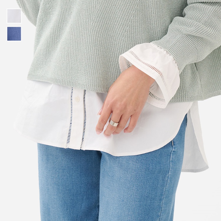 同じ素材ではらまきと付け袖もあり、一緒に着用するとまるで1枚のシャツをレイヤードしているような見た目にでき、