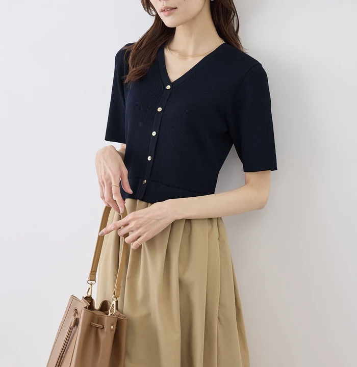 - メタル釦布帛ドッキングハーフスリーブニットワンピース