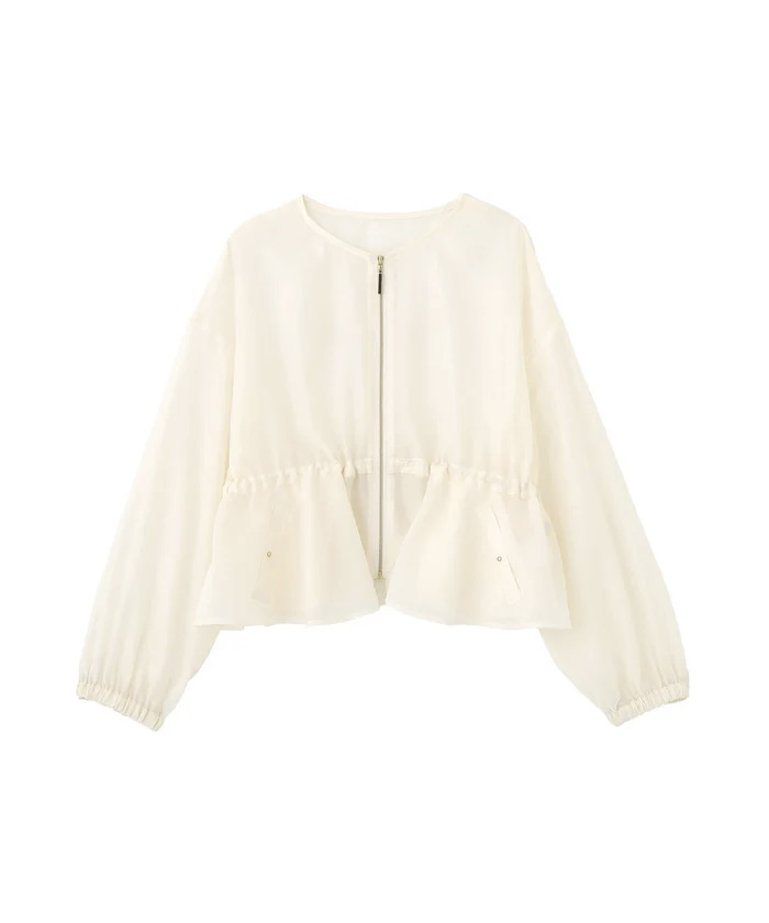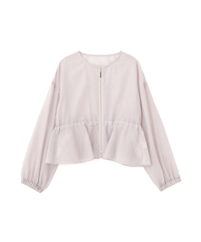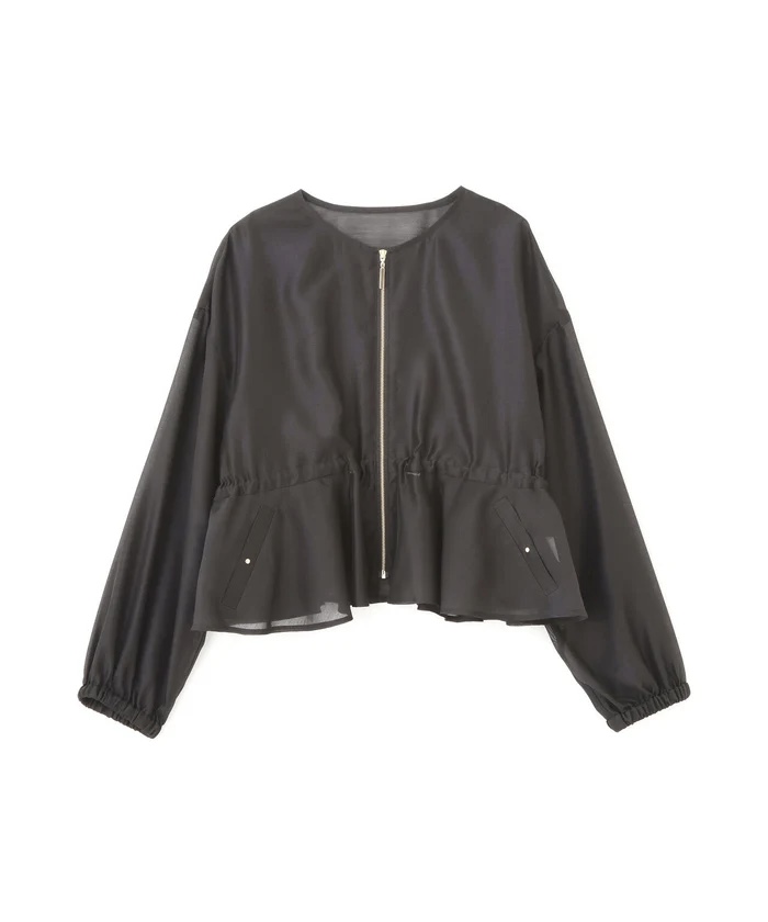 シアー素材を使用したブルゾン。シワになりにくく、ノーカラー仕様でキレイめスタイルとも相性バツグンです。短め丈で、ドロストを絞るとペプラムシルエットになり、脚長効果を狙いながらスタイルアップを叶えます♪