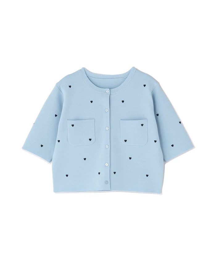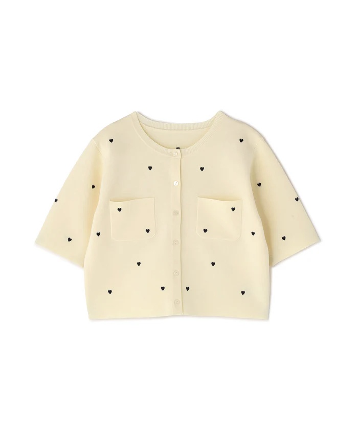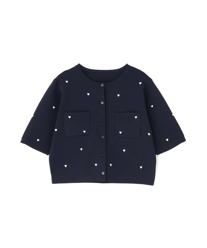 ハート刺しゅうがさりげなく可愛らしいニットカーディガン。ジャケットのようなしっかりとした風合いで、きちんと感のある一枚です。コンパクトなシルエットで、バランスよく着こなせます♡