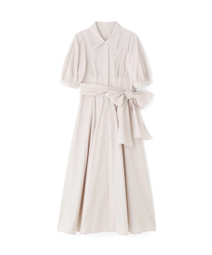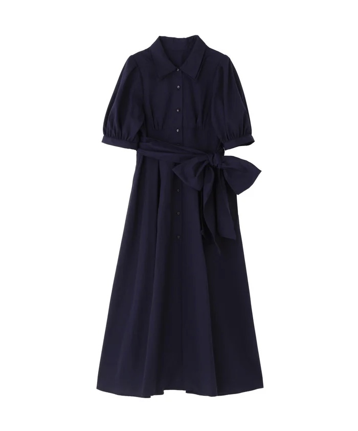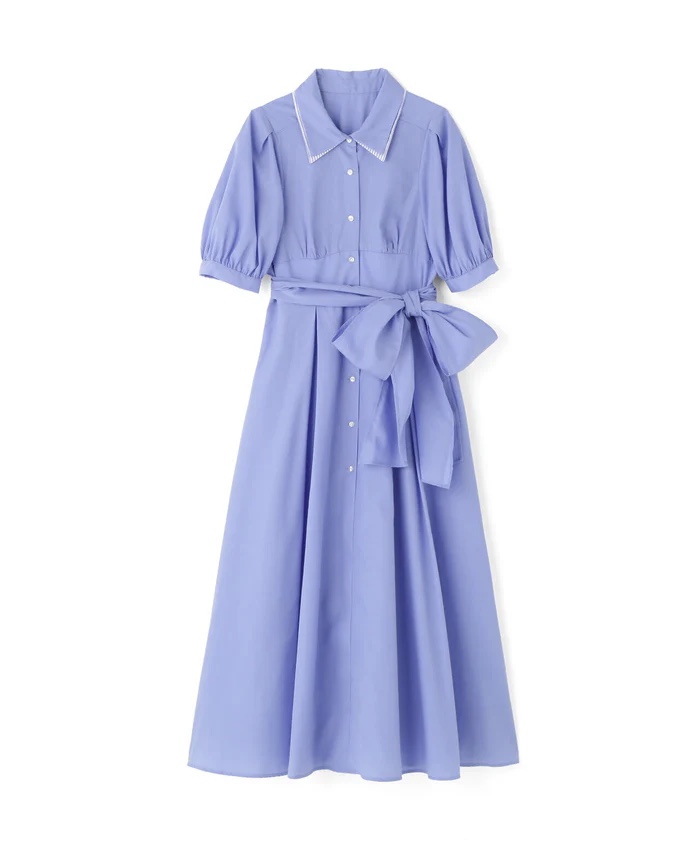 レイヤード風の衿が印象的なシャツワンピース。タック入りパフスリーブとボリュームフレアスカートが女性らしい動きをプラスし、高めウエスト切り替えで脚長効果を狙えます。共地ウエストリボンで可愛らしさを叶えれくれます♪