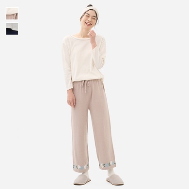 しめつけなしの楽ウェアを、気分があがる華やかスタイルで