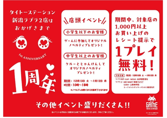タイトーステーション新潟ラブラ2店 1周年キャンペーン