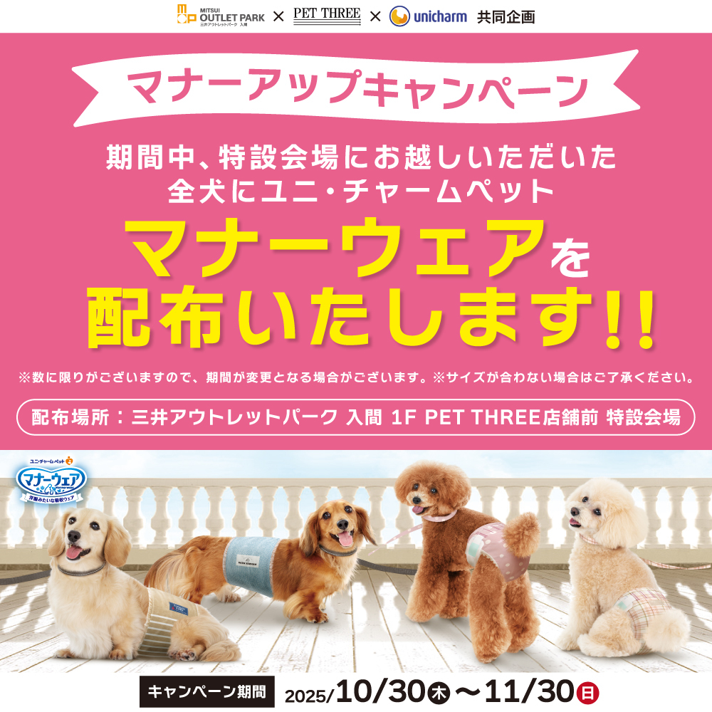 「三井アウトレットパーク」「PET THREE」「ユニ・チャーム」は愛犬と飼主様、そして誰もが安心で気持ちがいい環境でお買い物を楽しむ為に、合同でマナーアップキャンペーンを実施いたします。