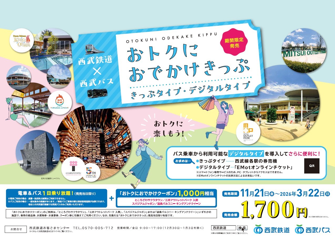 - 【西武鉄道・西武バス】おトクにおでかけきっぷ販売!おトクにおでかけクーポンで施設で使えるお買物券1,000円分と引換え可能!