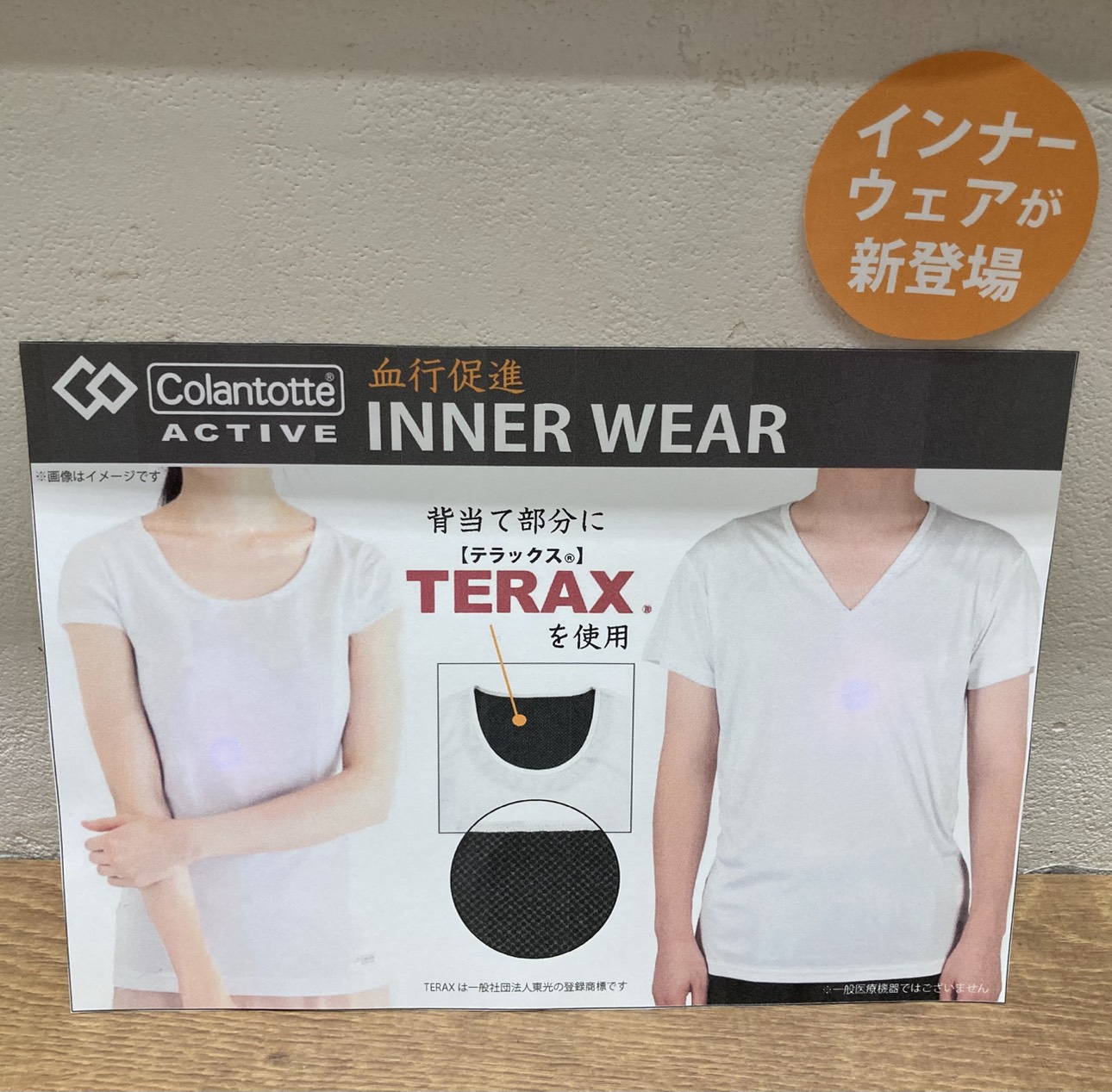 背当て部分にテラックス(天然鉱石を練り込んだ糸)使用で血行促進疲労回復効果が期待されます。