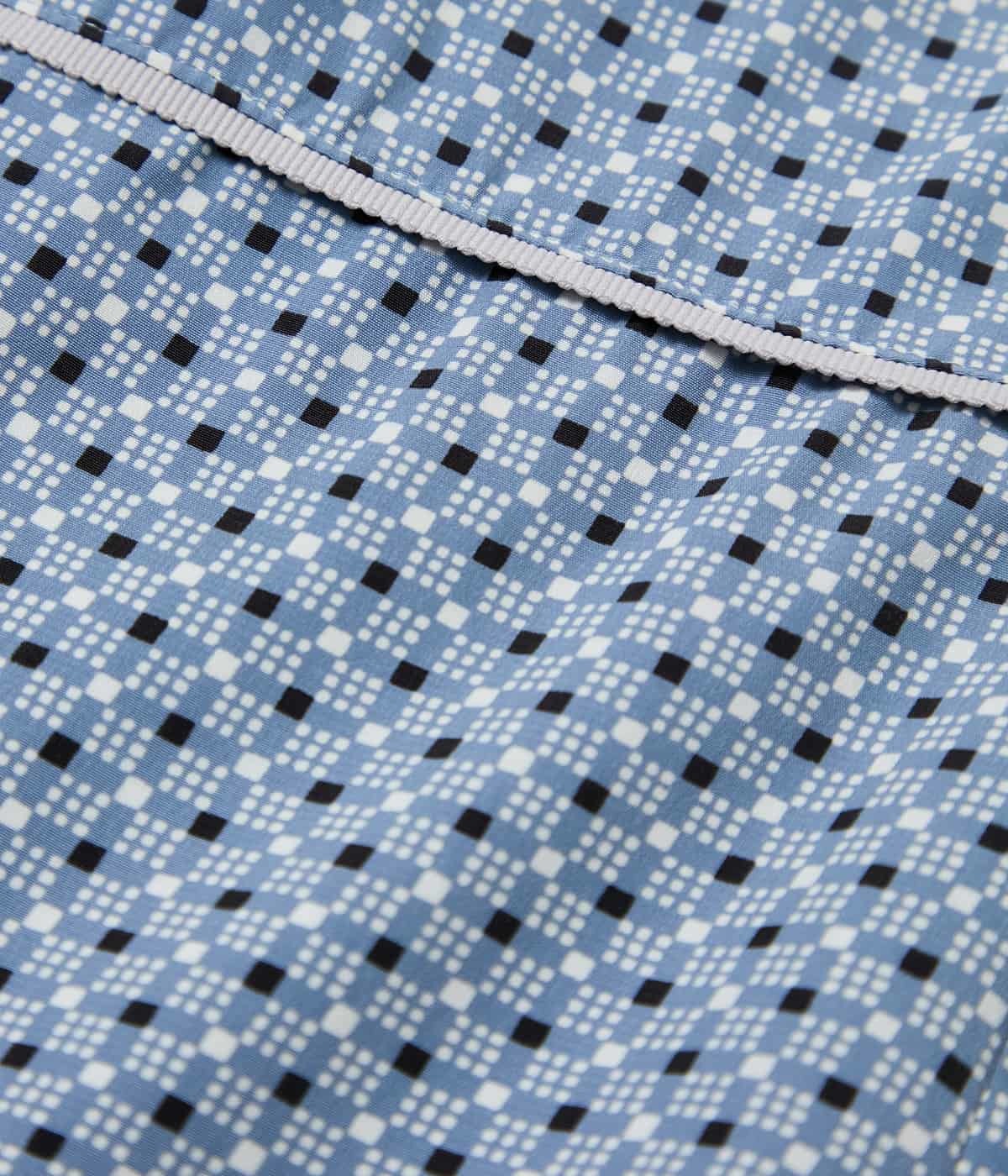 ポリエステル素材を使用したジオメトリックプリント生地。さらりとしたタッチで着心地が良く、軽やかな落ち感が特徴。ご自宅で手洗いが可能です。