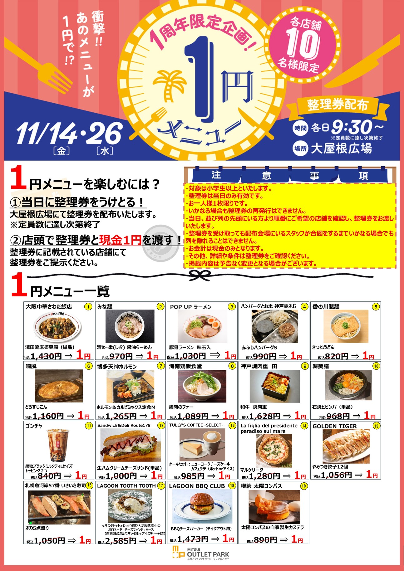 - 【11/14(金)・26(水)開催♪】あのメニューが!なんと1円!