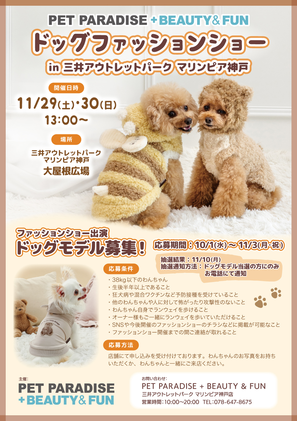 PET PARADISE+BEAUTY&FUN主催にて11/29(土)30(日)に「ドッグファッションショー in 三井アウトレットパーク マリンピア神戸」を開催いたします。
