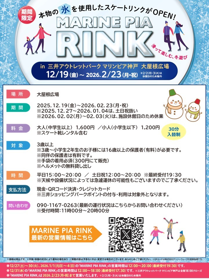 ※運行状況は、適宜Xにて毎日11時頃を目安に発信いたします。(アカウント名:マリンピア神戸スケートリンク@MARINEPIARINK)