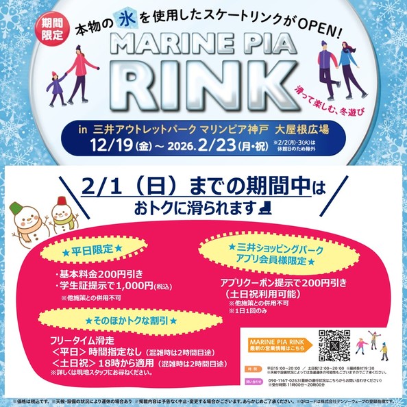 - 【MARINE PIA RINK】!2/1(日)までの期間限定! おトクに滑られるサービスのご案内♪