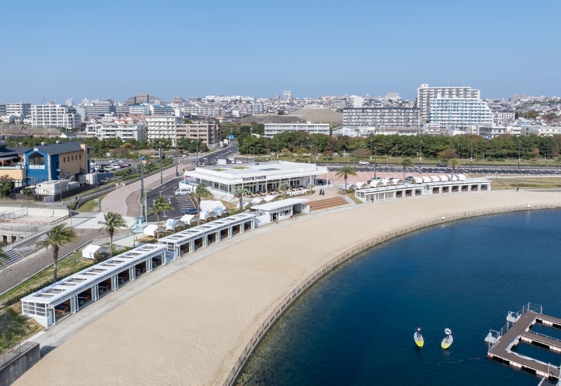ラグーンエリアの砂浜で心身を整え、仲間と一緒に気持ち良く走ろう。