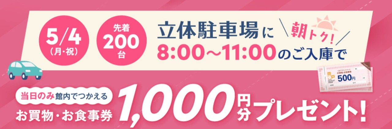 【5/4(月・祝)】【朝トク!】指定の立体駐車場に8:00~11:00のご入庫でお買物・お食事券1,000円分プレゼント!