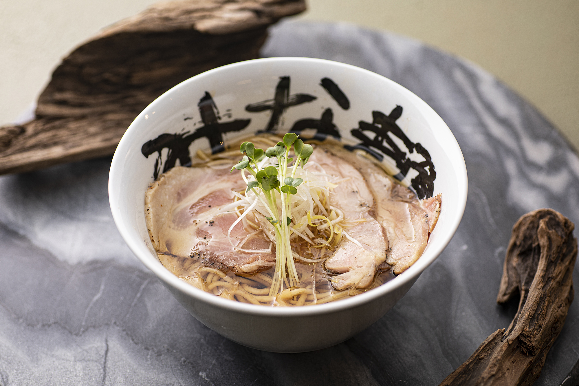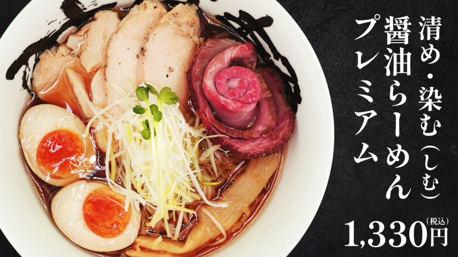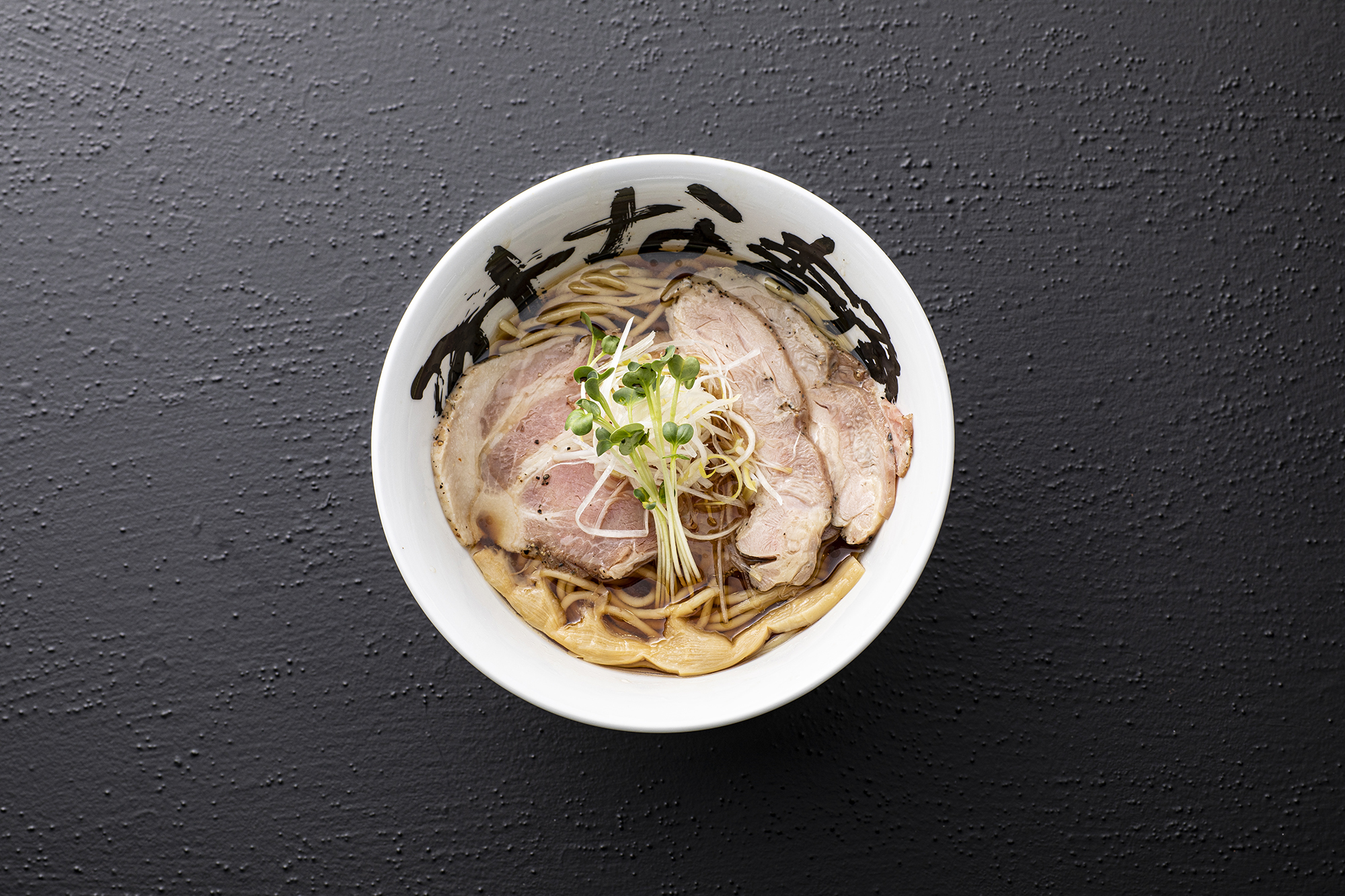 水と醤油だけとは思えないほど深みのあるスープに、レア焼豚と鶏チャーシューを贅沢にトッピングし、その上に白髪ネギとカイワレを添えています。