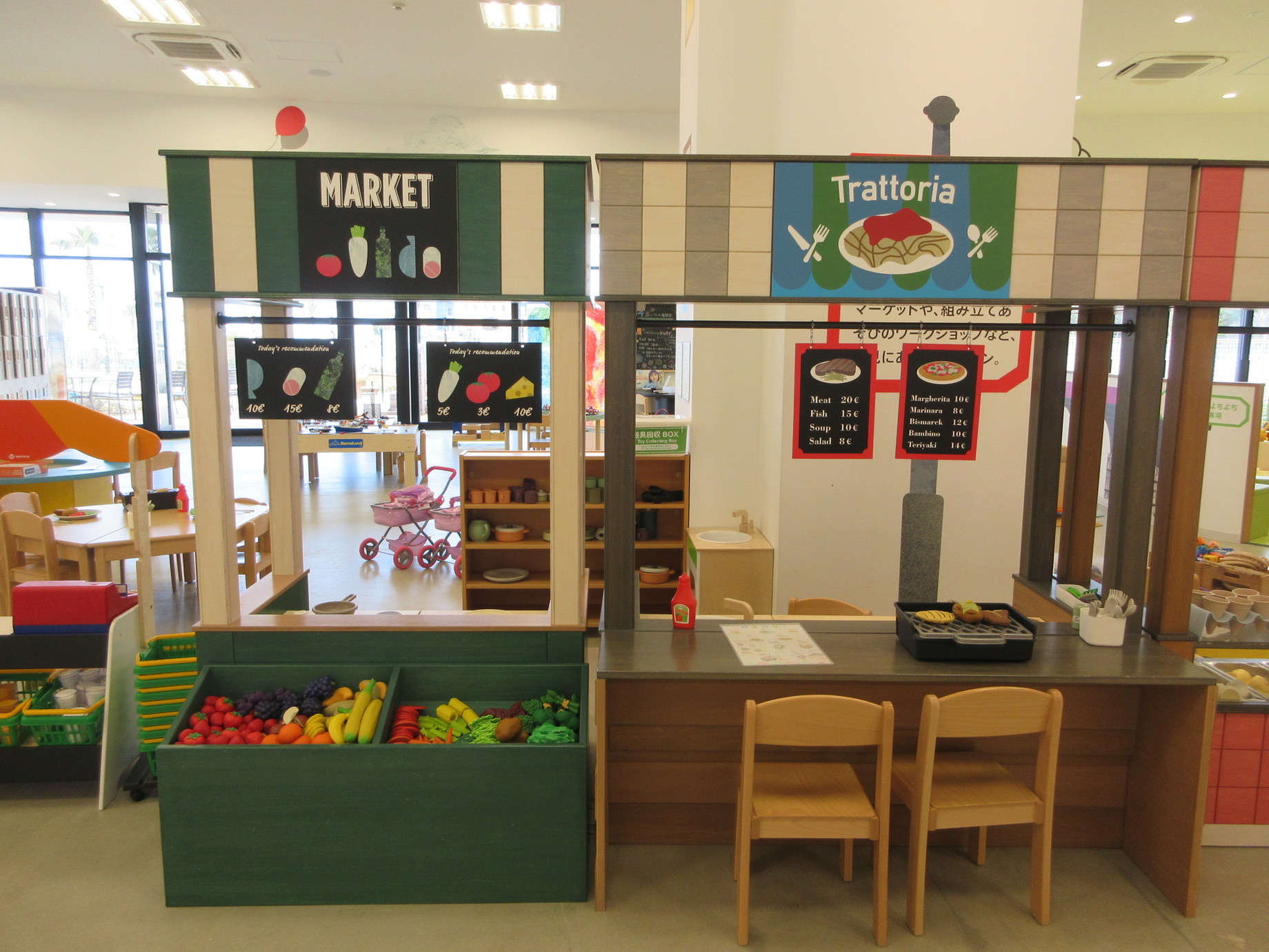 :キッチンでのおままごとやミニチュア・カーを使ったジオラマ遊び、さまざまな色・かたちのブロックを使った組み立て遊びが楽しめます。