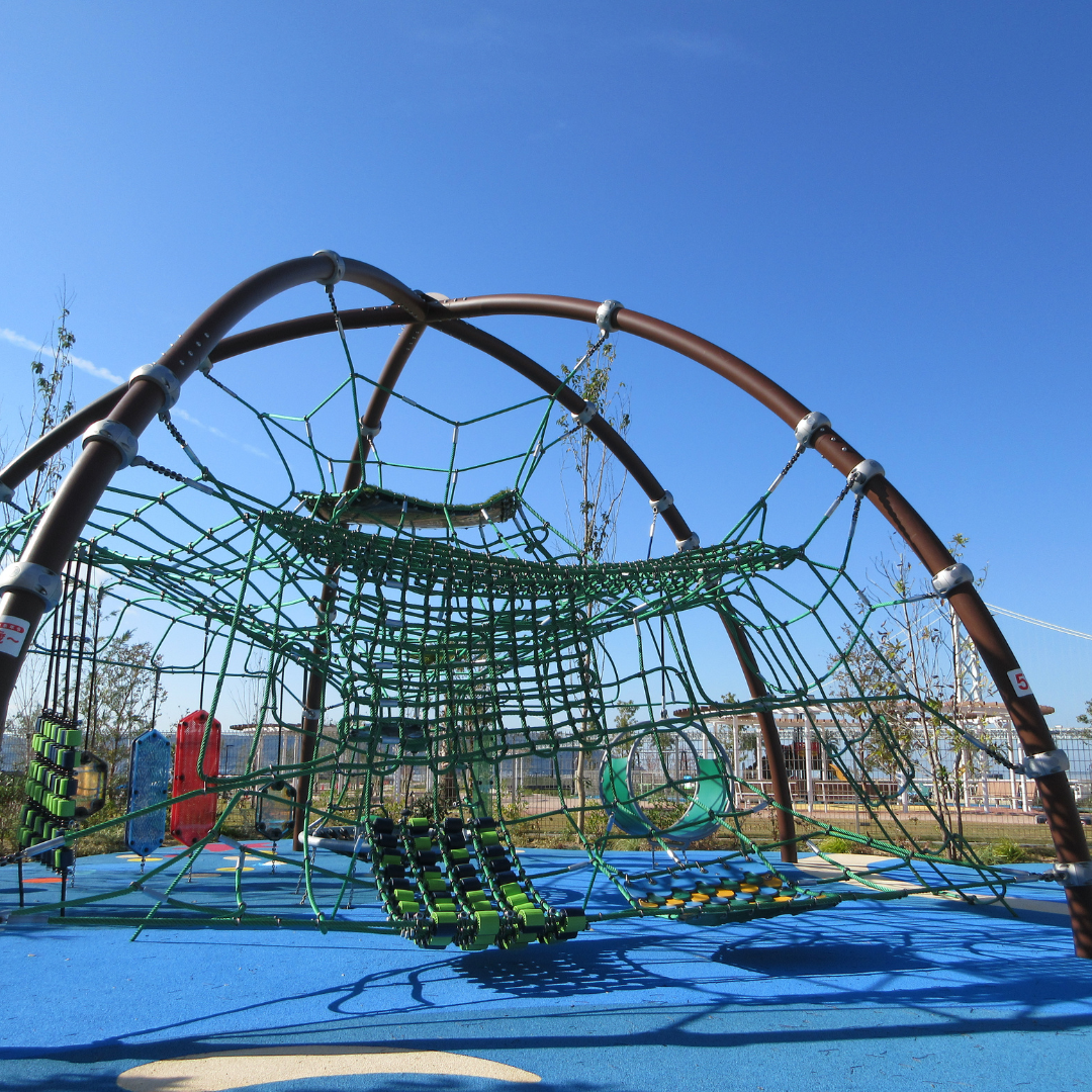 :頂上までのぼると遠くの海まで見渡せる、ロープでできた大きなドームです。ドームの中には、見て触って楽しめるしかけがあり、はずむ揺れを体感しながら光や感触のふしぎを発見できます。