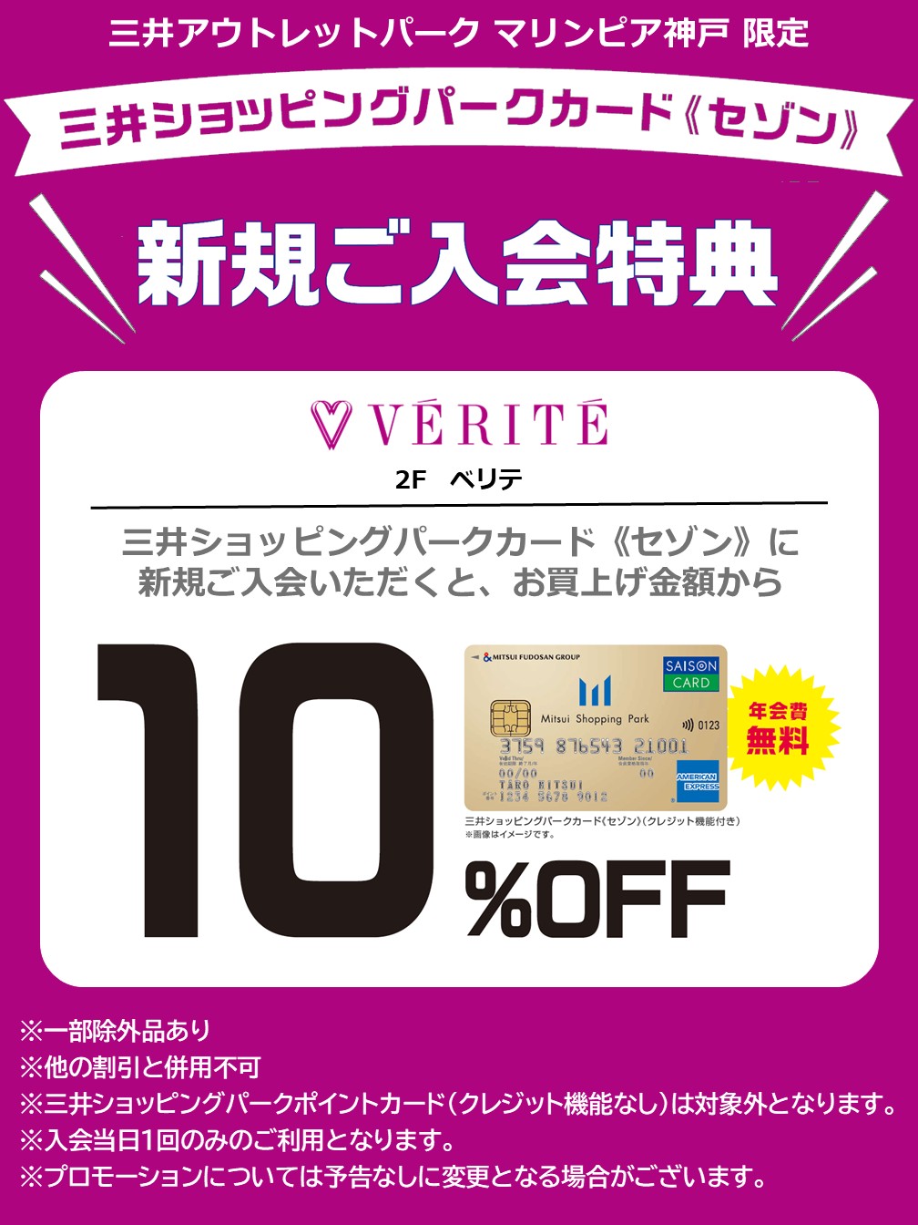 ぜひこの機会に、三井ショッピングパークカード≪セゾン≫に新規ご入会いただき、オトクにVERITEをお楽しみください。