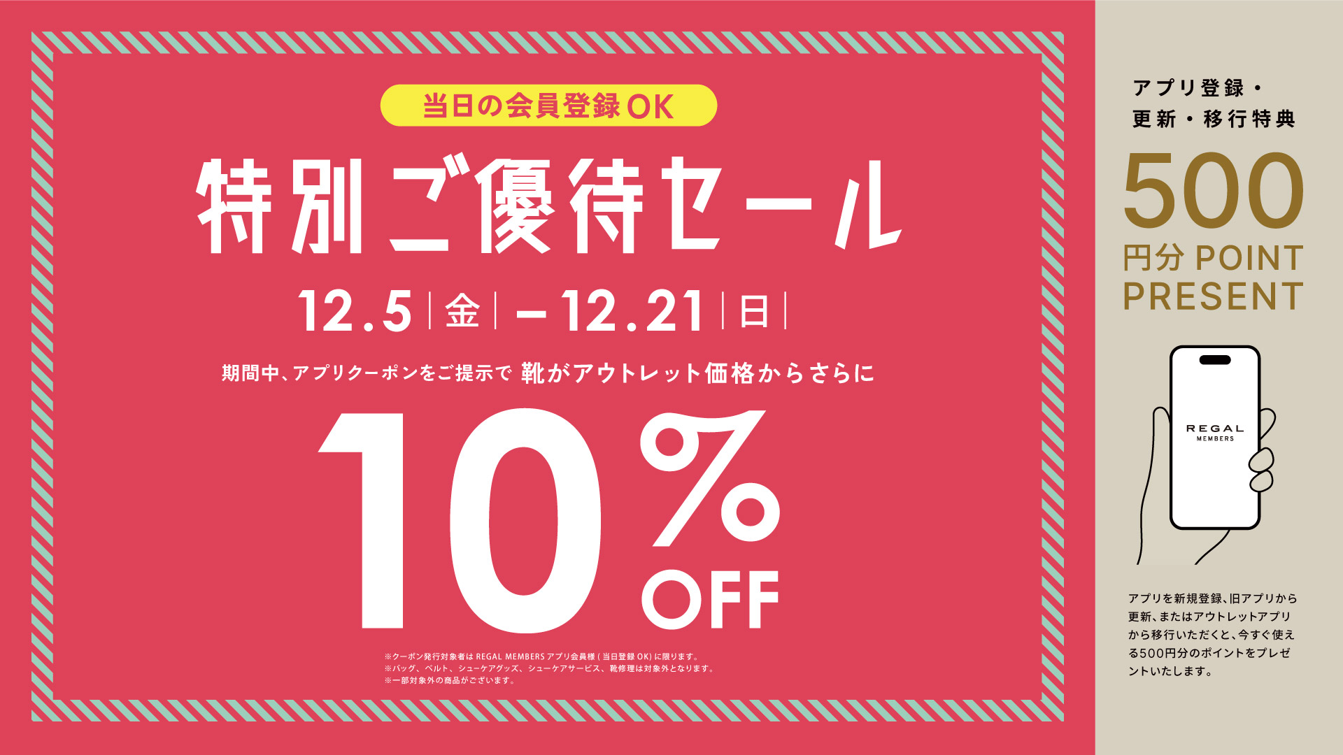 期間中アプリクーポンをご提示いただければ靴がアウトレット価格からさらに10%OFF