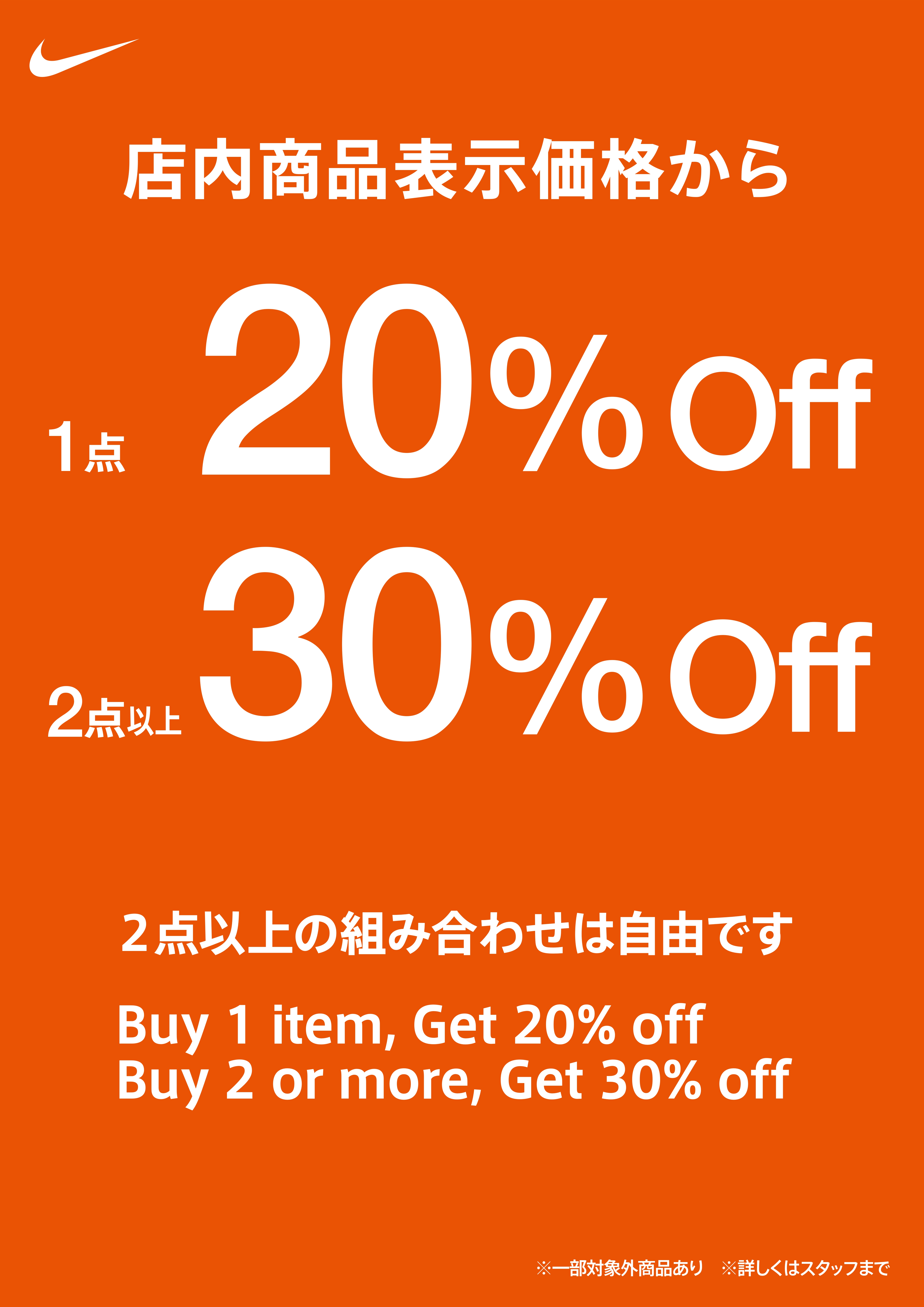 店内表示価格から、1点ご購入で20%OFF、2点以上のご購入で30%OFFとなります。