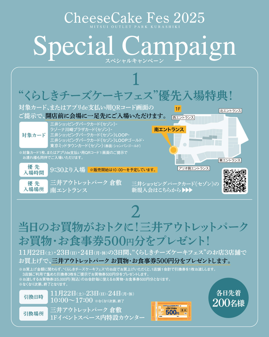 11月22日(土)・23日(日)・24日(月・休)の3日間、くらしきチーズケーキフェスのお店3店舗でお買上げいただくと、三井アウトレットパークお買物・お食事券500円分をプレゼントいたします♪