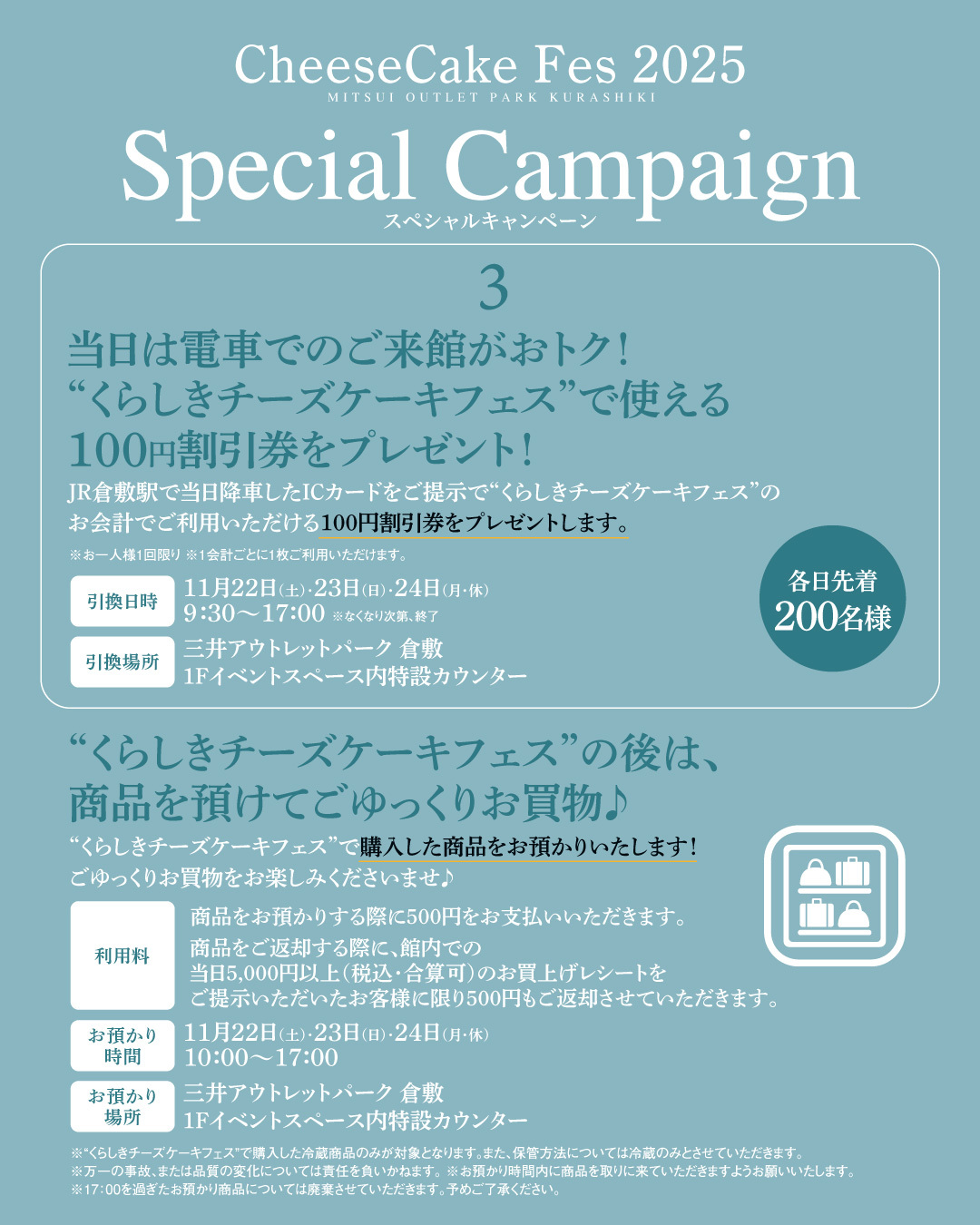 JR倉敷駅で当日降車したICカードをご提示でくらしきチーズケーキフェスのお会計でご利用いただける100円割引券をプレゼントいたします。