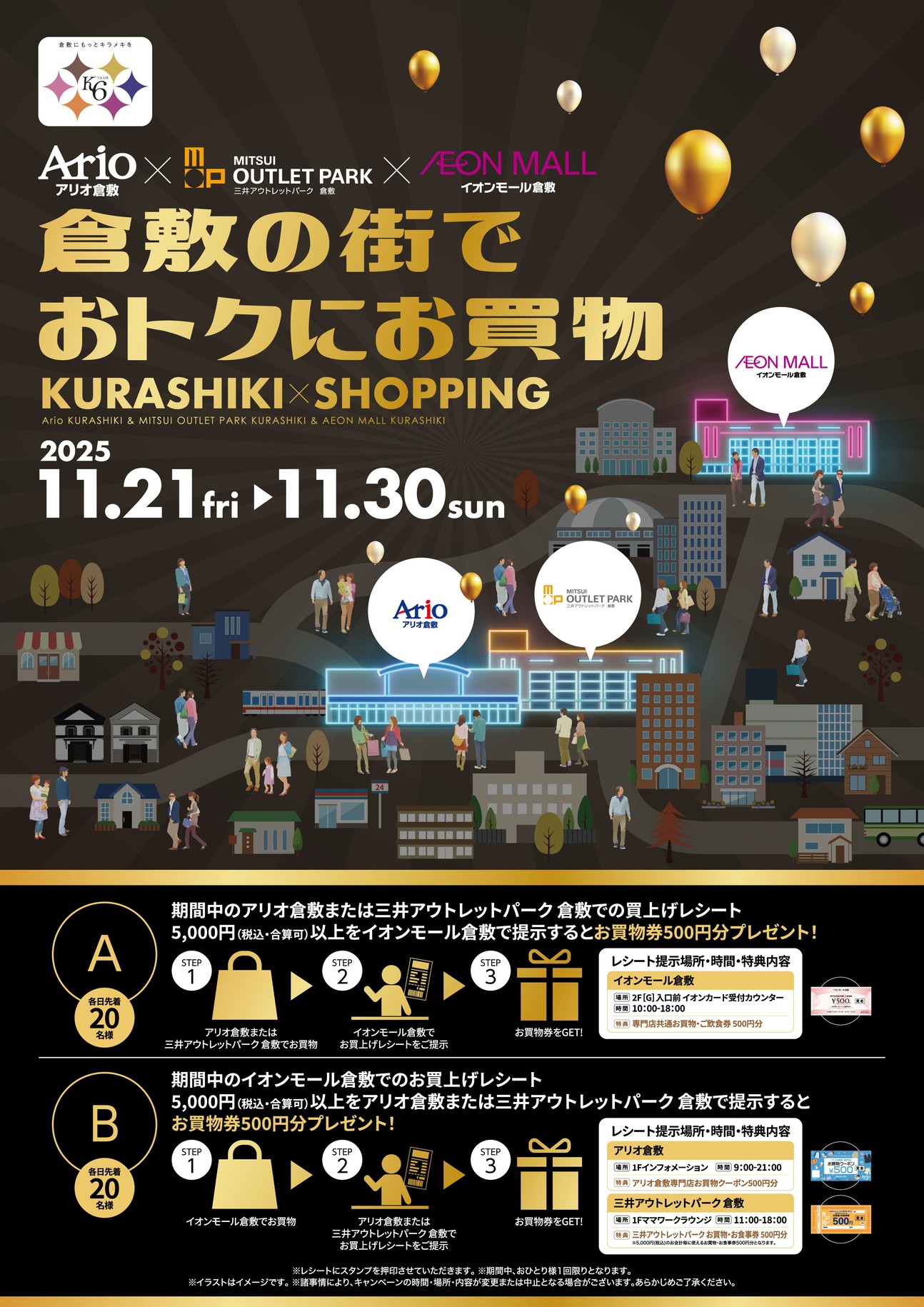 (A)期間中のアリオ倉敷または三井アウトレットパーク 倉敷での買上げレシート3,000円(税込・合算可)以上を
