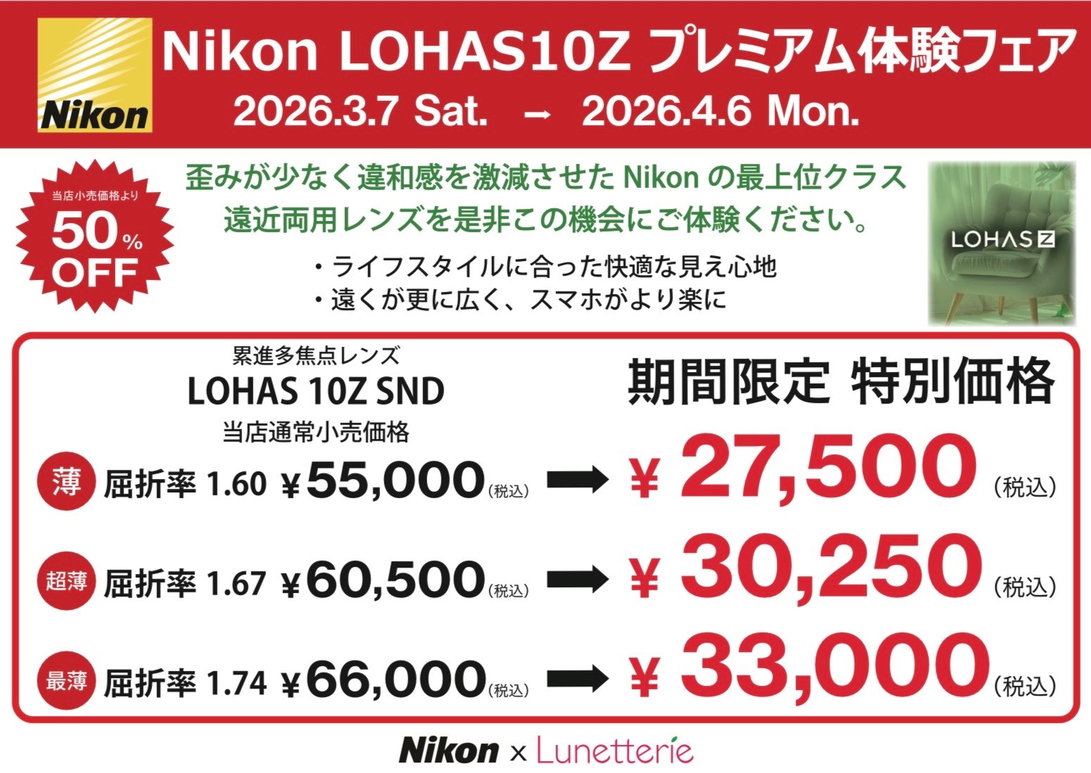 4/6(月)までの期間中遠近両用レンズが50%オフとなっております。